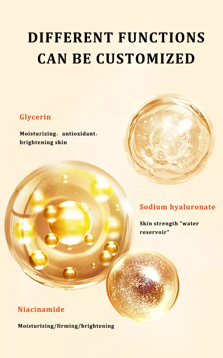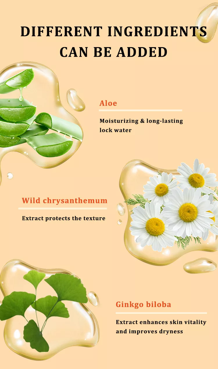 Мы также можем настроить формулу, которую вы хотите, на основе конкретных ингредиентов продукта (например, основная гиалуроновая кислота, ниацинамид, витамин Е, определенные растительные экстракты и т. д.), аромата (например, роза, белый чай, без запаха и т. д.), а также наличия особых эффектов (например, сильное восстановление, отбеливание, укрепление и т. д.).